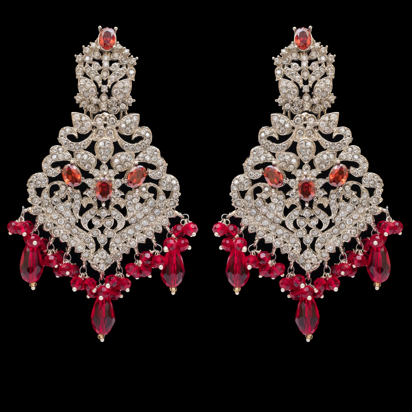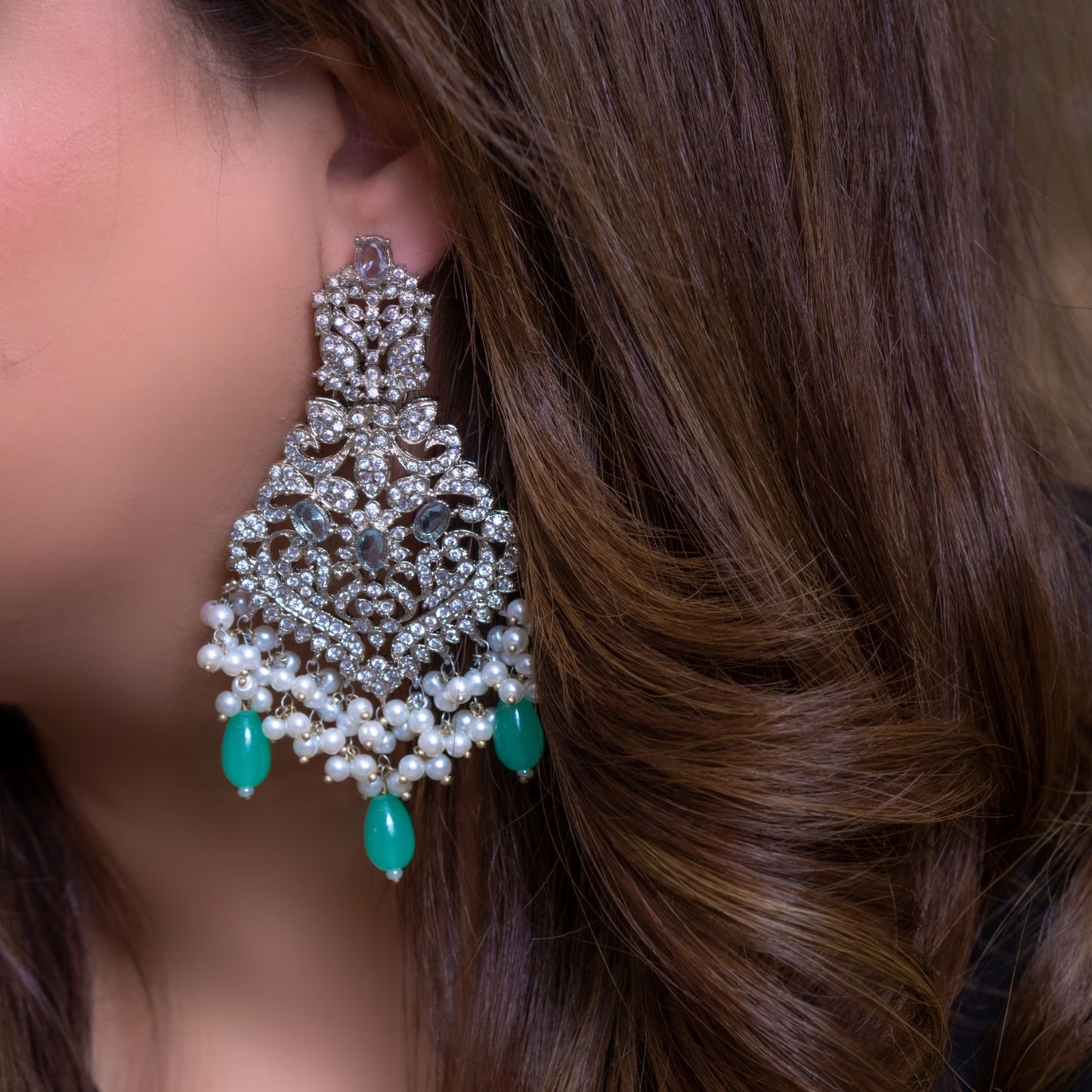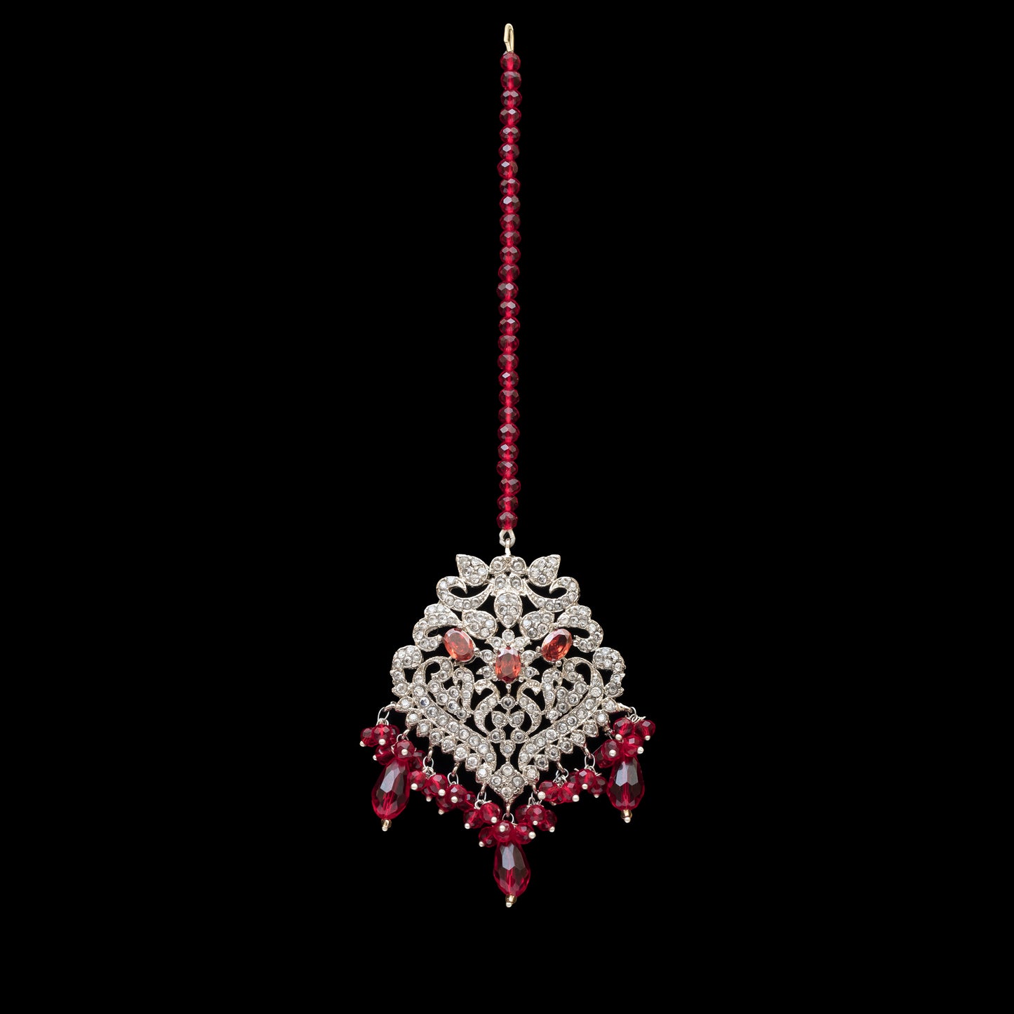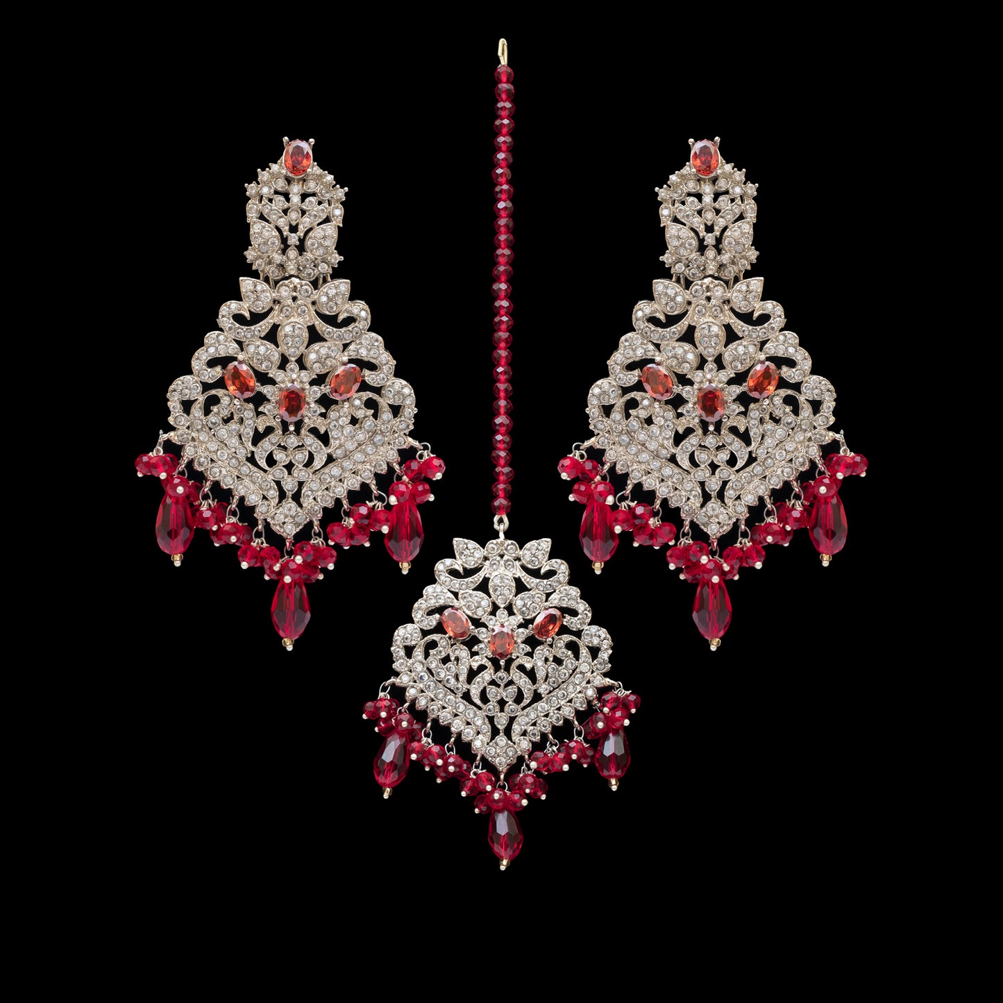 Make a statement with polki earrings and tikka set, adorned with divine motifs and intricate carvings, symbolizing grace, perfect for embracing elegance and poise.