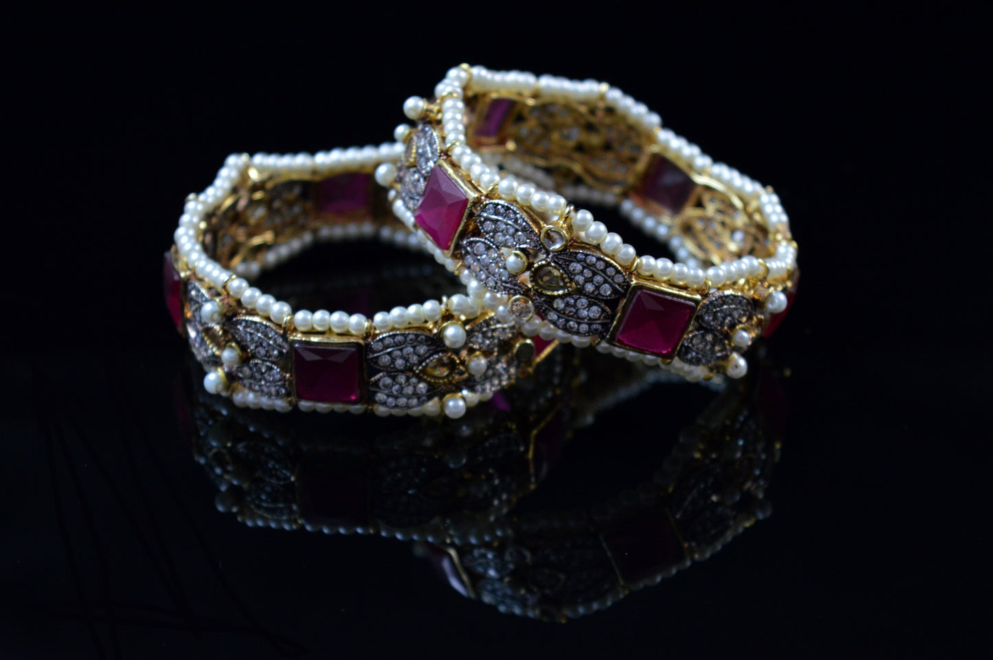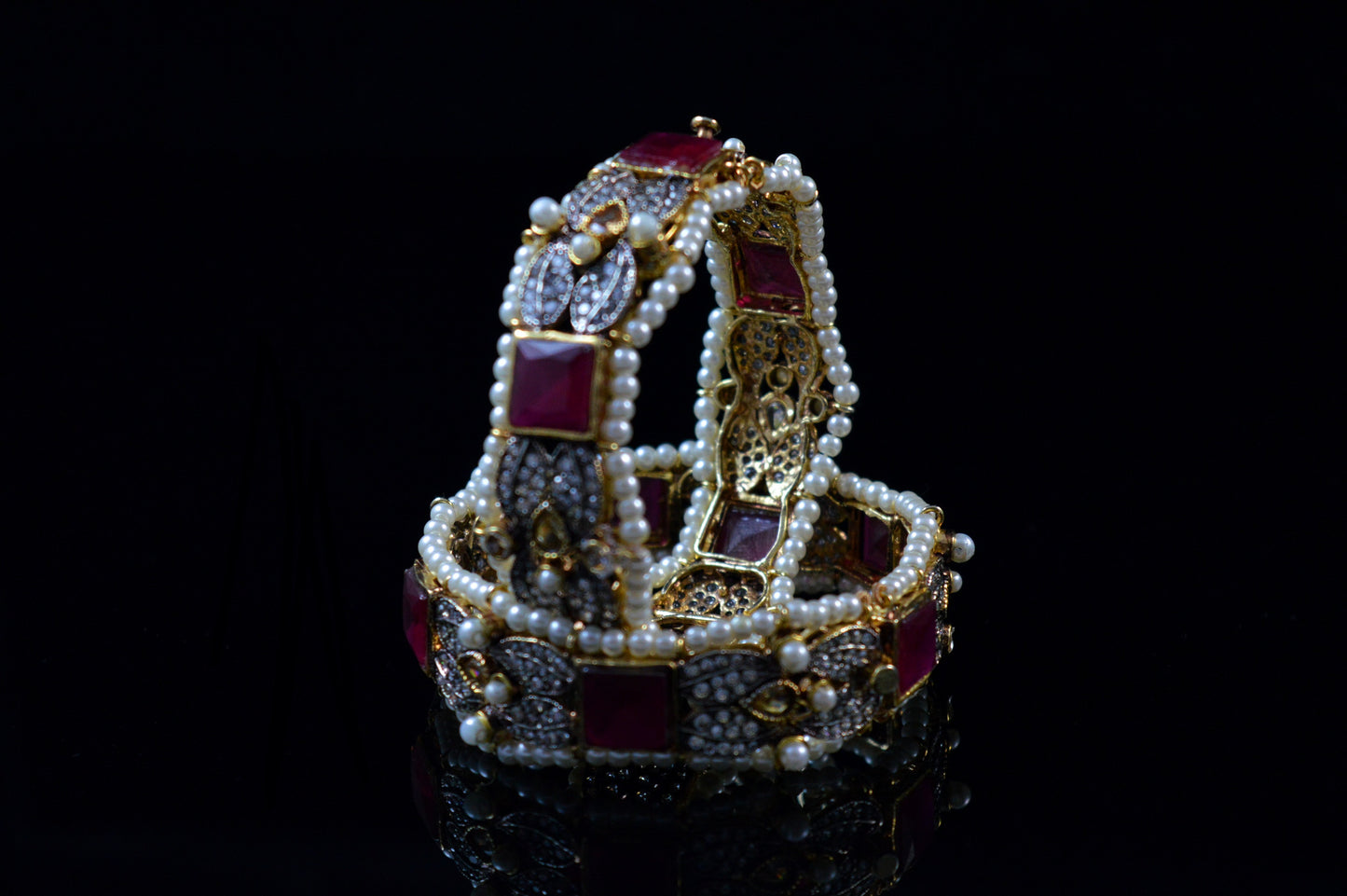 Crafted for the modern woman who values tradition, these bangles evoke a dazzling interplay of Ruby and pearl work along with the bangles' hems that are adorned with delicate pearls, adding a touch of finesse to your every gesture.